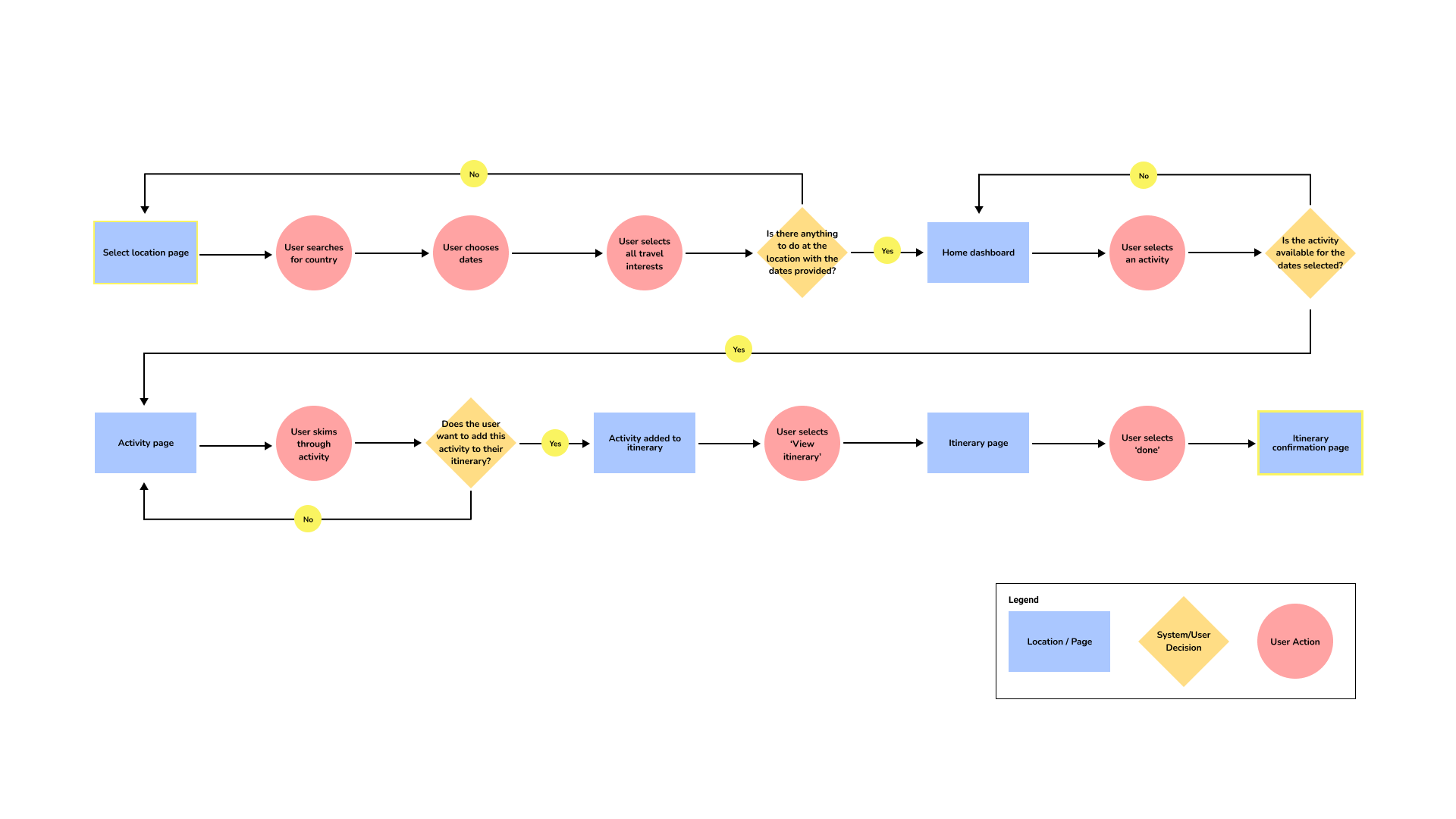 After identifying my core tasks, I developed a task flow to illustrate how Nazanin would plan a trip and create an itinerary based on her travel interests.