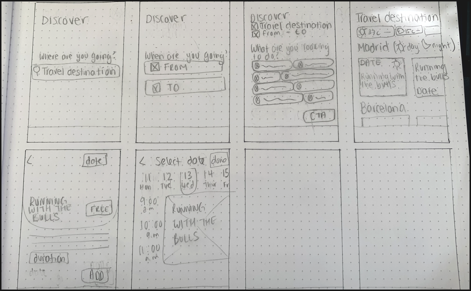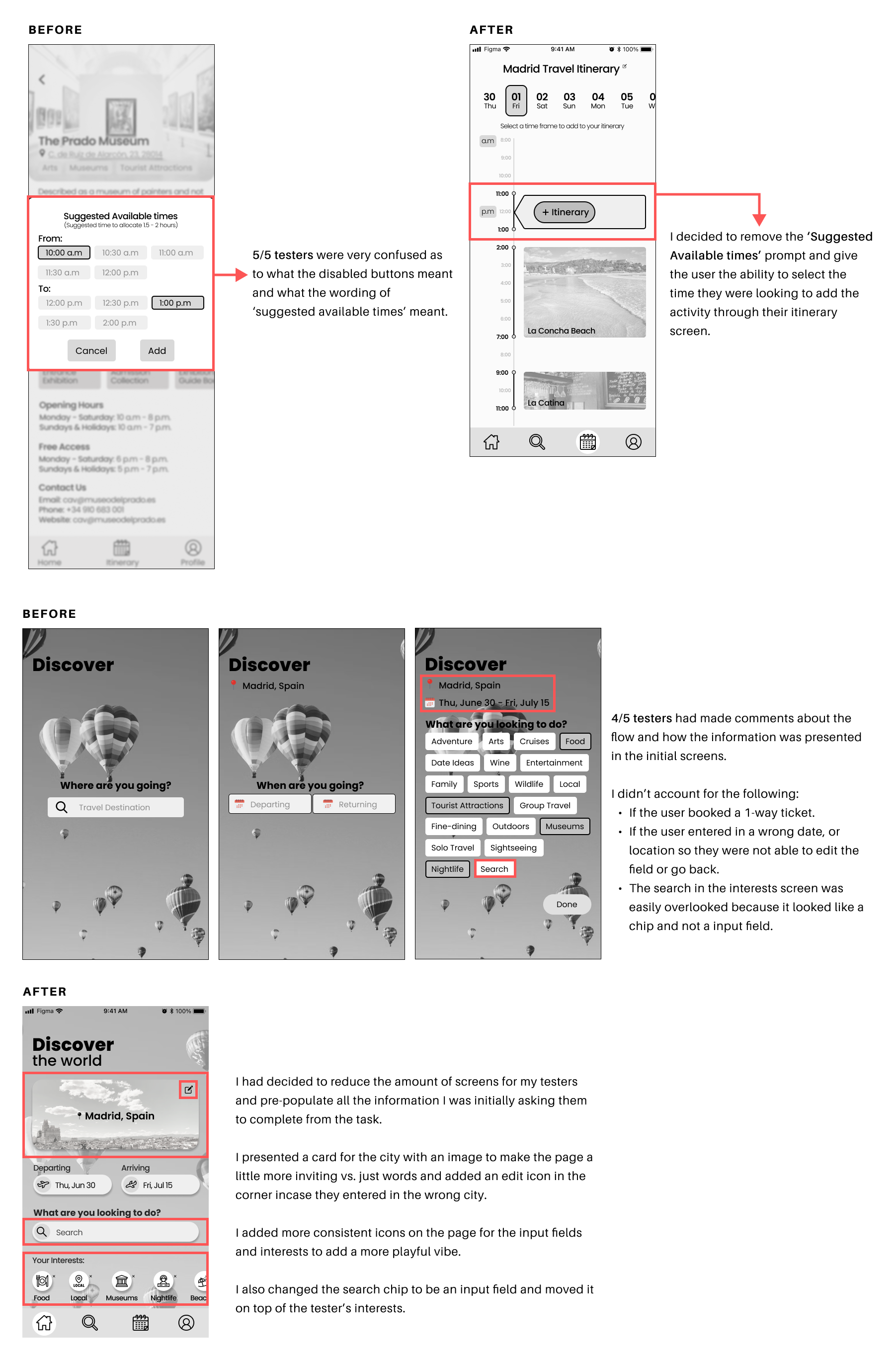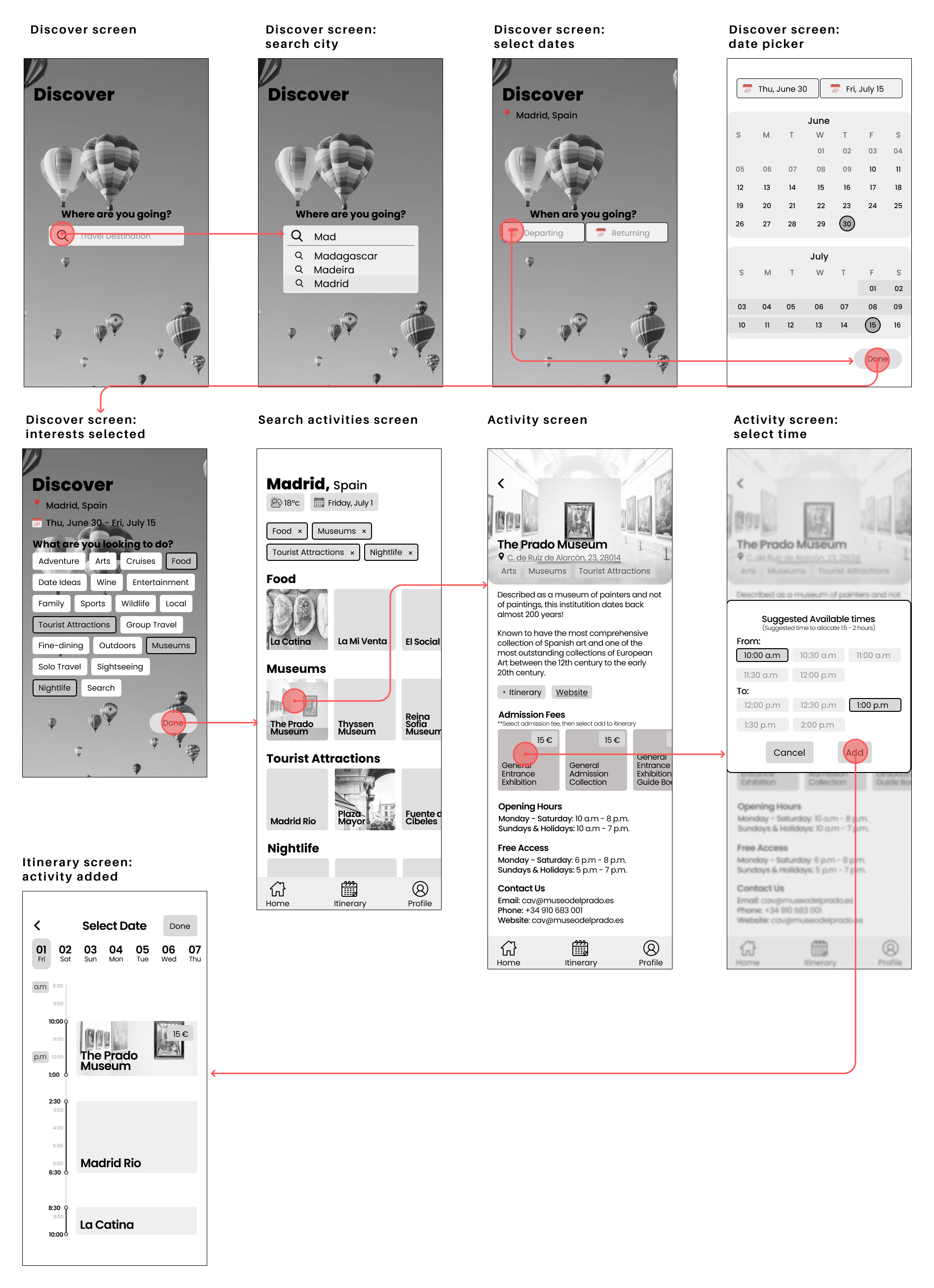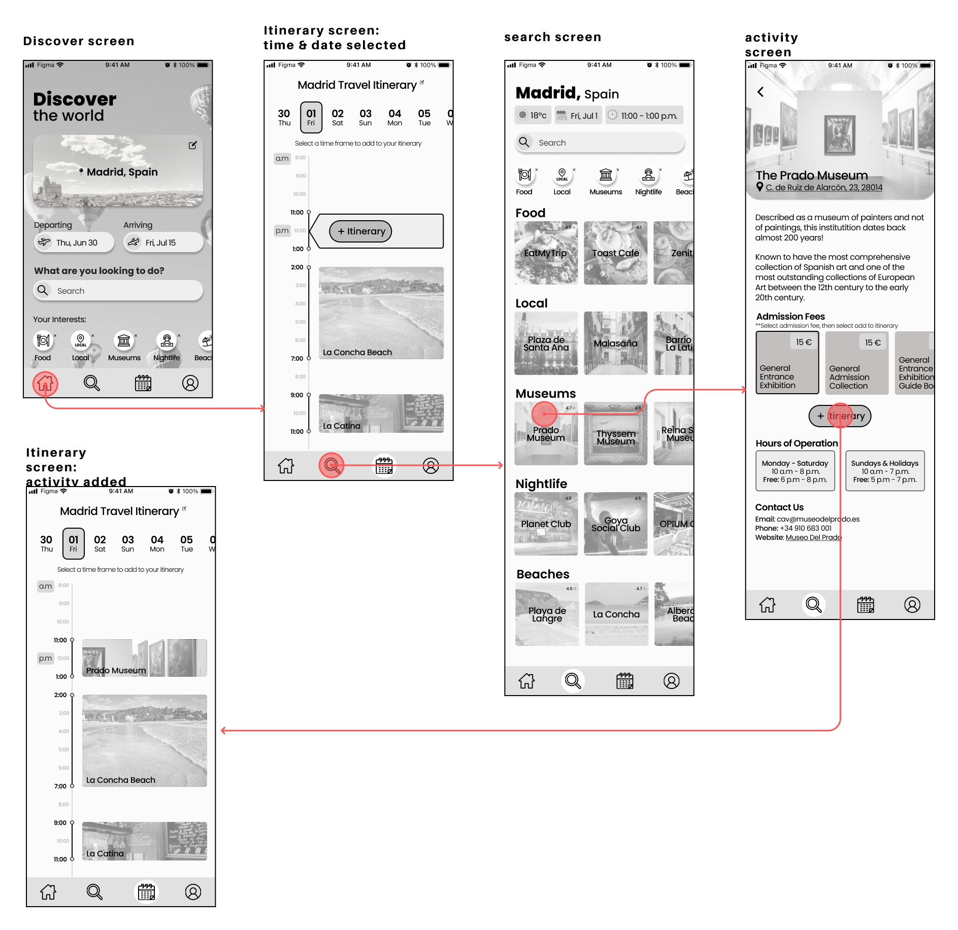 “Imagine you’ve already booked a ticket to Madrid, Spain, from June 30th to July 15th. Your selected interests are food, beaches, museums, and nightlife. You navigate to your itinerary page, select 11 a.m. to 1 p.m., and see The Prado Museum on your discovery page, which you want to add to your itinerary. How might you go about doing this?”