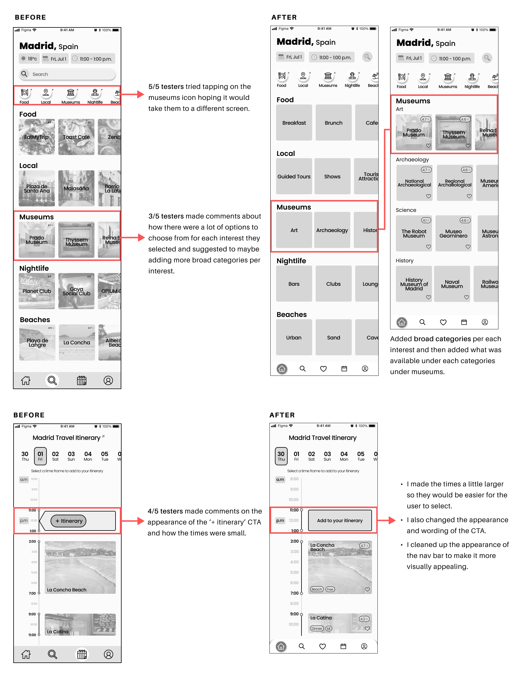 Based on my design matrix, I highlighted key changes made in response to the feedback I received. Not all changes are displayed, and not everything was revised; as mentioned earlier, I focused on adjustments in the 'high impact/low effort' quadrant.