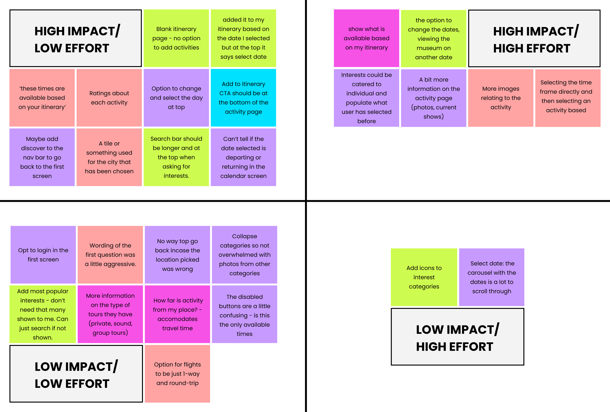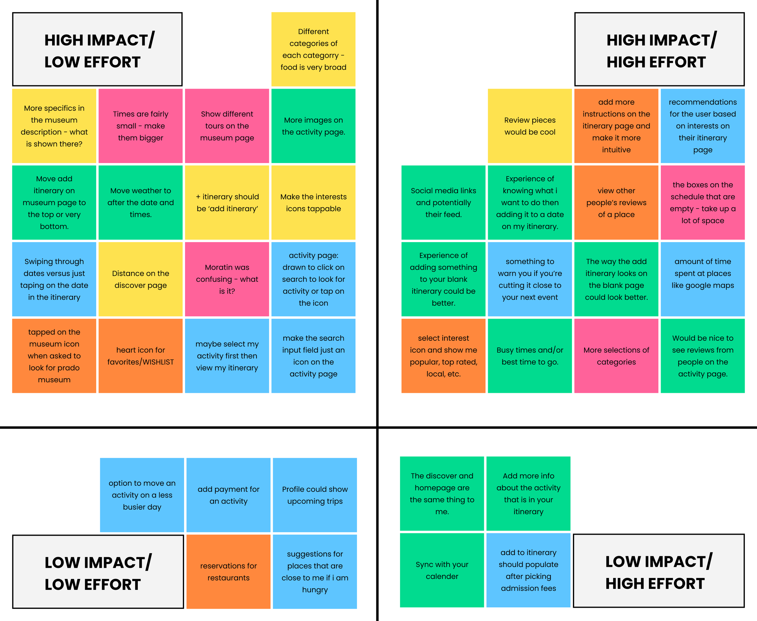 Based on feedback from my first round of usability tests, I identified users' pain points and additional features they desired. I organized these insights into a design prioritization matrix, focusing on the 'high impact/low effort' quadrant due to time constraints.