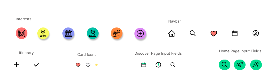 I opted for minimalistic icons that incorporate some of the tertiary colours from my selected palette. This choice not only enhances the overall design but also adds visual interest without overwhelming the user interface. By maintaining a clean and modern aesthetic, the icons effectively complement the app's vibrant colour scheme, making navigation intuitive and enjoyable for users.